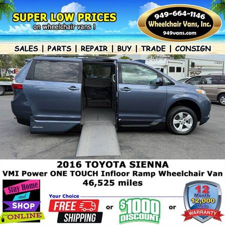 2016 Toyota Sienna Wheelchair Van Minivan Exterior Color: Shoreline Blue Pearl Interior Color: Ash Engine: 3.5L V6 266hp 245ft. lbs. Fuel: Gasoline Transmission: Automatic Drivetrain: Front Wheel Driv